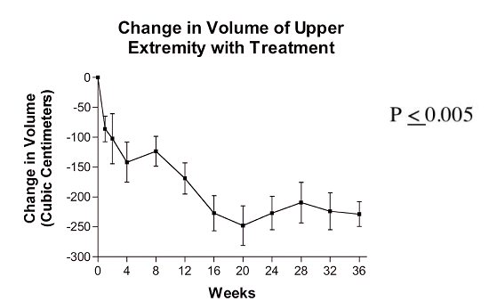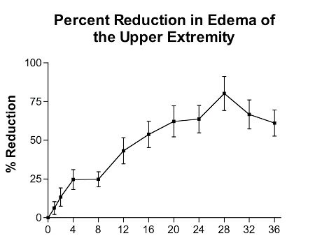 The patients demonstrated rapid and consistent reduction in lymphedema during the first 4 weeks of treatment, achieving a 25% reduction in lymphedema by the 4th week. Between weeks 4 and 8, no significant improvement was observed. Subsequent to week 8, continued reduction was observed. 50% reduction in lymphedema was observed at 16 weeks and 80% reduction was observed at 28 weeks. Between weeks 28 and 36 there is an apparent increase in lymphedema among these patients; however, nearly half of these patients achieved effective control of the lymphedema and entered the maintenance phase of treatment and were seen less frequently. As a result, patients with effectively controlled lymphedema were no longer included at these late time points. Nevertheless, patients with more severe lymphedema were responding and the reduction these patients achieved was 50 to 75% at 36 weeks.