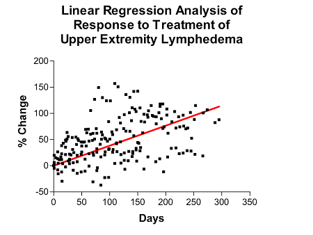 Scattergram of the effect of the ReidSleeve BioCompression/Optiflow System. Linear regression analysis demonstrates progressive decrease in lymphedema with time of treatment.
