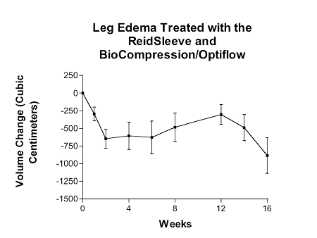 Effect of Combined Treatment with ReidSleeve and BioCompression Optiflow among patients with lower extremity lymphedema. 19 patients with refractory lymphedema were followed for 16 weeks following initiation of treatment using the Duke protocol. The reduction in tissue volume of the affected extremity is shown.