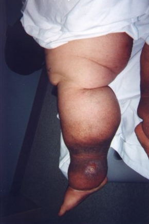 This patient reports the initial signs of swelling first appeared one month after surgery in 1993 for a ruptured vericose vein to the distal anterior portion of the right lower extremity, darkened discoloration, and textured skin changes.