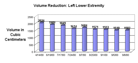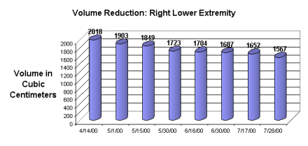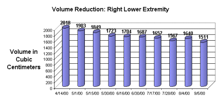The graph does not represent volume reduction in the abdomen, for which we had no good measuring tools. Functionally, however, this patient reports decreased pain in the back, decreased difficulty with ambulating, and the ability to fit into his clothes. This patient resumed driving on April 25, 2000 after 35 treatments.