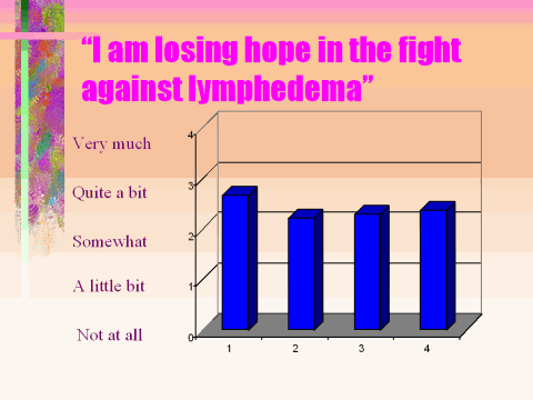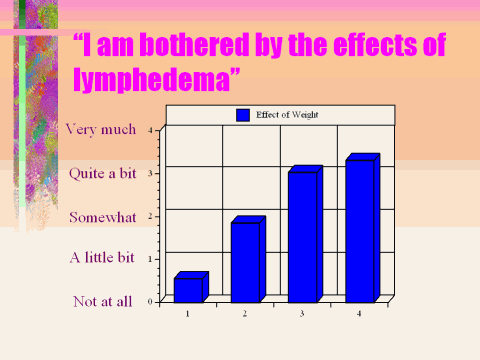 To date, this survey has helped answer some important questions concerning the effect of body weight on lymphedema. This study demonstrates a link between increased weight and increased lymphedema and more frequent infections in the affected limb. This study also demonstrates that most of the women with lymphedema have a strong family support system and also feel they have a good support system among their friends. It also appears that most women remain hopeful and optimistic that they will overcome lymphedema; however, it is also evident some women are starting to lose hope. While this study does not yet demonstrate that weight reductions plans will improve lymphedema, it does demonstrate that women in the normal weight range have less swelling, fewer infections and participate more frequently in activities that they enjoy. I will continue this analysis and look more closely at several other emotional aspects of lymphedema.