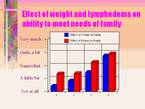 "Because of weight lymphedema, I have trouble meeting the needs of my family." These are two related questions that are used in our quality of life studies to assess how an illness impacts family life. When someone cannot do the things necessary to meet their families needs, then the quality of their life may be significantly impaired. Simple things like making dinner or going out for a walk with the family become difficult or impossible. Clearly, as weight increases, it becomes a significant factor in a woman's ability to meet the needs of her family. However, in all groups, they report that the edema causes more impairment than weight. This suggests that treating lymphedema can significantly improve the quality of life for all patients, but especially for those whose weight is higher.