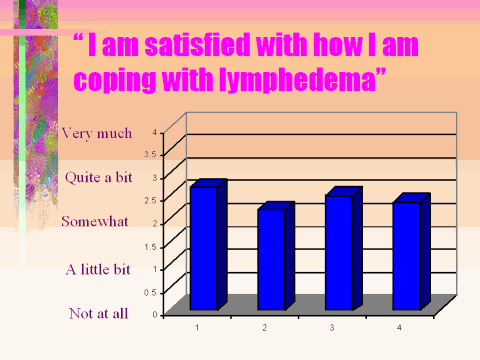 "I am satisfied with how I am coping with lymphedema" When asked about how well they were coping with lymphedema, these same women appear to remain generally upbeat and positive. Most of the women felt they were coping with lymphedema fairly well. Notably, there was very little difference among the different weight groups as to how well they felt they were coping with lymphedema. So, while increased weight is associated with increased edema and greater limitations in daily activity and increased number of infections (link to previous graphs), they remain relatively positive about how well they are coping with these problems.