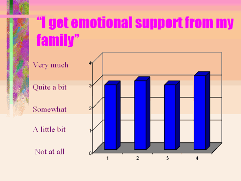 "I get emotional support from my family." In the previous eNews I also examined the effects of weight and lymphedema on the ability of a woman to meet the needs of her family. In all weight categories, women reported that lymphedema had a greater detrimental effect on their ability to meet the needs of their family than weight. However, as the average weight increased, the degree of lymphedema also became worse, impairing their ability to meet the needs of their families. Despite the effects of both weight and lymphedema on a woman's ability to meet the needs of their family, the women responding to this survey feel they get a lot of emotional support from their families. When comparing the effects of weight, there was very little difference in the amount of support received from the families among the different weight groups. Regardless of weight or degree of swelling, most of these women felt they had a lot of support from their families.
