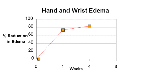 In this study many of the patients had edema of the hand. When the amount of edema in the hand was analyzed we found a 72% reduction in edema in the first week and an 88% average reduction in hand and wrist edema by 4 weeks. See figure above.